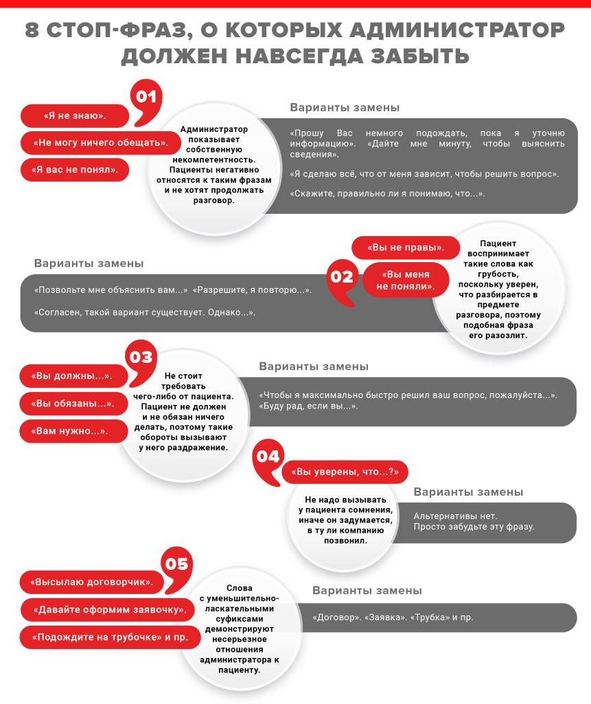 Если вы считаете, что причина в безынициативности администраторов, не спешите с выводами. Прежде чем обвинять сотрудников в бездействии, проанализируйте сценарий их разговора с потенциальным пациентом. Возможно, в скрипте есть фразы, которые отталкивают и раздражают клиентов (см. гайд в конце статьи). В этой статье мы разберем три неочевидные ошибки в скриптах, которые могут отпугнуть пациентов.